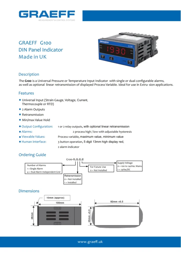 G100은 하나 또는 두 개의 설정 가능한 알람과 공정 변수 출력을 위한 선형 재출력(옵션)을 갖춘 범용 압력 또는 온도 입력 스마트 컨트롤러입니다. G100 스마트 컨트롤러는 GRAEFF 고온 용융 압력 센서와 함께 사용할 경우 압출 시스템 애플리케이션에 이상적입니다.